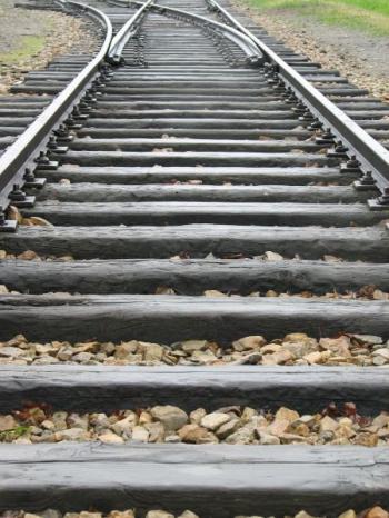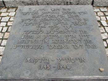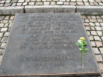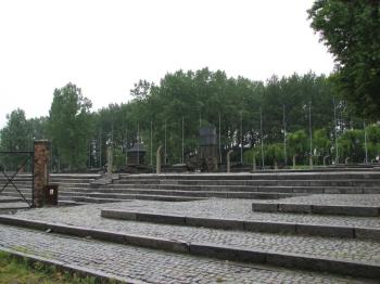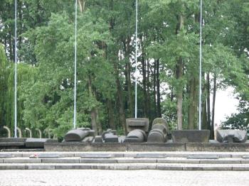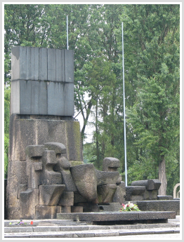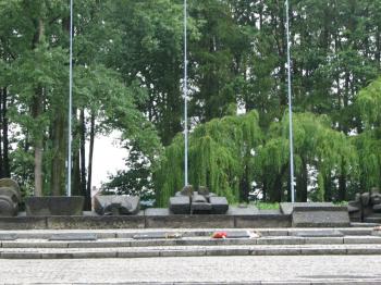 Na końcu torów kolejowych wznosi się rozłożysty Międzynarodowy Pomnik Ofiar Faszyzmu.