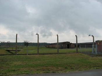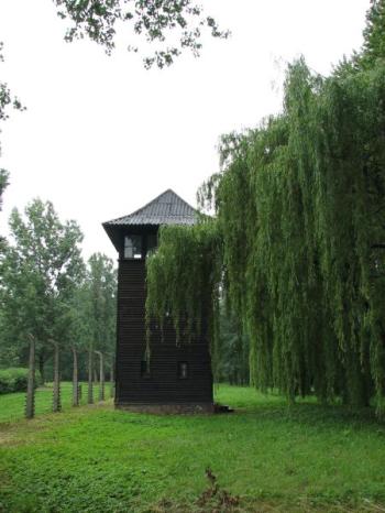 "Brama Śmierci" - główna brama wjazdowa do byłego obozu, przy której ciągnie się ogrodzenie z drutów kolczastych, a wewnątrz znajdują się parterowe budynki z surowej cegły oraz główna wartownia obozu. Nad bramą, przez którą przebiega tor kolejowy, wznosi się piętrowa wieża wartownicza, z której okien można zobaczyć panoramę byłego obozu.