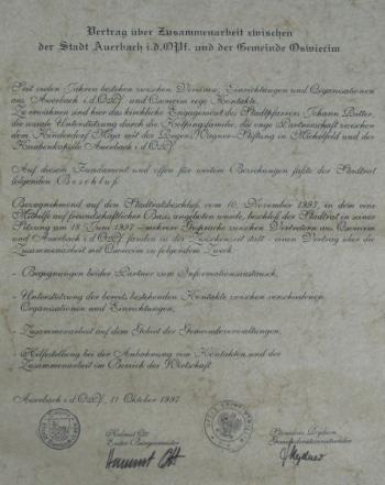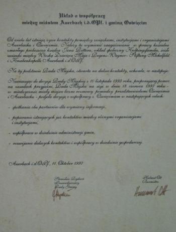 W 1997 roku Gmina Oświęcim podpisała porozumienie o wzajemnej współpracy z bawarską Gminą Auerbach. Dwustronne kontakty mają na celu poznanie języka w środowisku rodzinnym partnera, zapoznanie się z historią i kulturą jego kraju, praktyki zawodowe, wymianę doświadczeń. Do podpisania porozumienia doszło dzięki wieloletnim kontaktom mieszkańców Auerbach z przedstawicielami Fundacji "Maja" oraz pracownikami i wychowankami Wioski Dziecięcej im. Janusza Korczaka w Rajsku.