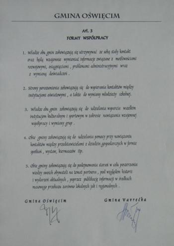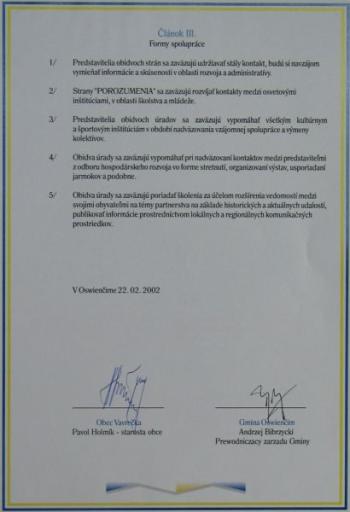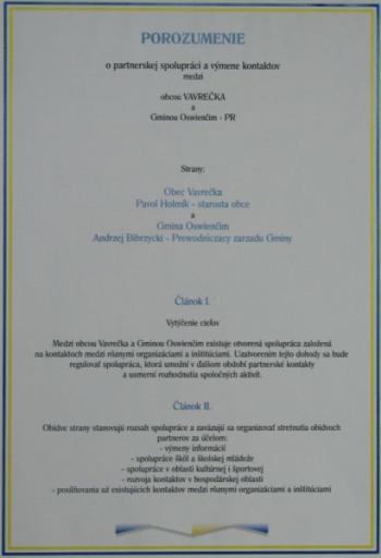 22 lutego 2002 roku nawiązano również współpracę ze słowacką Gminą Vavrečka.