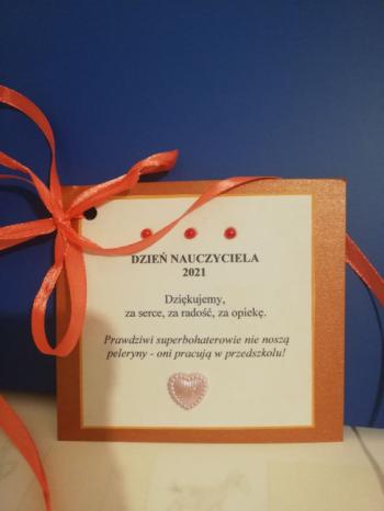 Dzień Edukacji Narodowej to wyjątkowe święto dla pracowników oświaty. Dzieci z grupy Tropicieli w imieniu wszystkich przedszkolaków 14 października podziękowały swoim Paniom i Pracownikom przedszkola, za naukę i opiekę, poprzez wiersze płynące prosto z serca. Dzieci podziękowały również wszystkim pracownikom obsługi za trud włożony w ich edukację i wychowanie. Wręczając piękne laurki wyraziły wdzięczność za opiekę, naukę, troskliwe ramiona, czyste sale i smaczne posiłki.