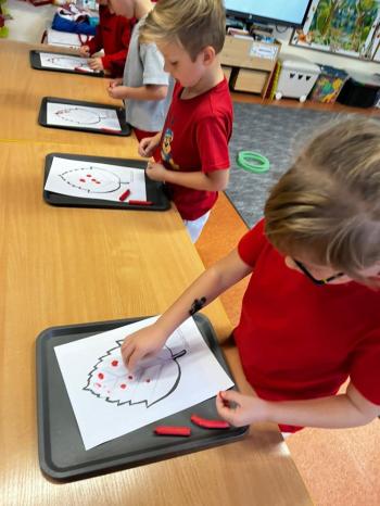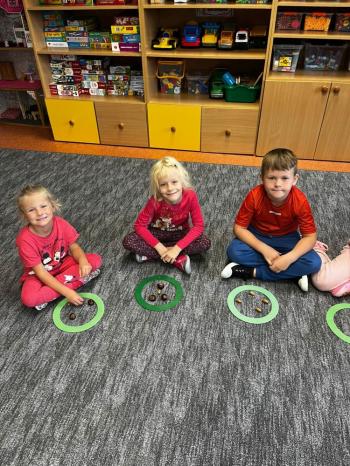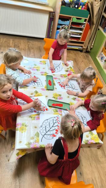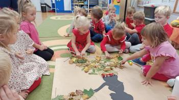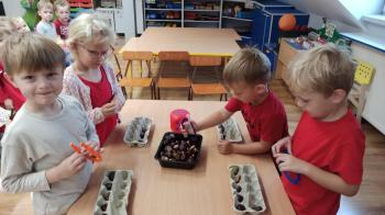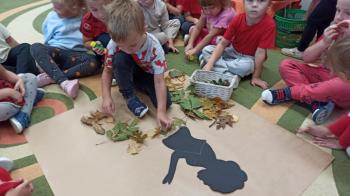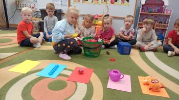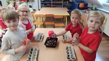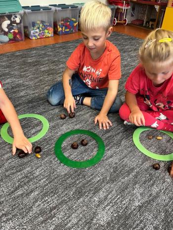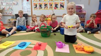 • "Kaczuszki" - Segregowanie przedmiotów według koloru, zabawa ,,Raz, dwa, trzy… liczysz ty”, zabawa manipulacyjna ,,Kasztanki”, zabawa orientacyjno-porządkowa „Kolory do domu”. Wykonanie pracy plastycznej ,,Pani Jesień”.