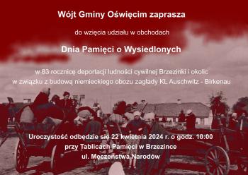 Wójt Gminy Oświęcim Mirosław Smolarek zaprasza do wzięcia udziału w obchodach Dnia Pamięci o Wysiedlonych w 83. rocznicę deportacji ludności cywilnej Brzezinki i okolic w związku z budową niemieckiego obozu zagłady KL Auschwitz-Birkenau.