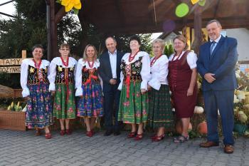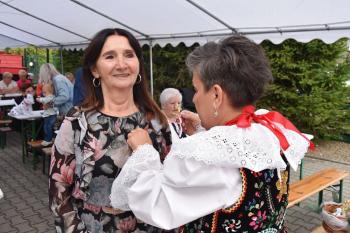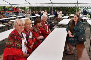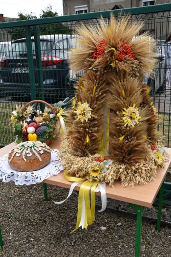 Nie zabrakło także części artystycznej – na scenie wystąpiły panie z KGW Harmęże, które zaprezentowały piękne pieśni o sołectwie i gminie. W wyjątkowej atmosferze przewodnicząca KGW wraz z sołtysem przekazali wójtowi symboliczny bochen chleba, którym następnie częstowano mieszkańców. Całość dopełniały tradycyjne dekoracje dożynkowe – wieńce, snopy zbóż, kwiaty i owoce, które stworzyły niepowtarzalny klimat.