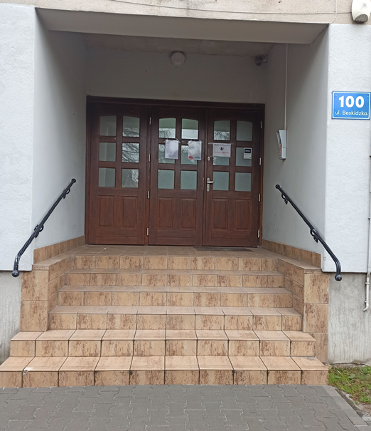 Żeby wejść do budynku trzeba pokonać 6 schodów. Schody są szerokie i mają poręcze.
