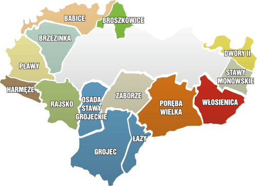 Babice, Broszkowice, Brzezinka, Dwory Drugie, Grojec, Stawy Grojeckie, Harmęże, Łazy, Pławy, Poręba Wielka, Rajsko, Stawy Monowskie, Włosienica i Zaborze.