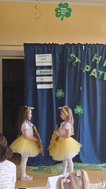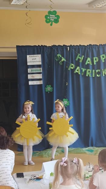 Dziewczynki z grupy"Marynarze" Anielka i Ania brały udział w konkursie "My green Ireland" zorganizowanym przez Niepubliczne Przedszkole Smyk w Babicach. Dziewczynki zaśpiewały piosenek 'You are my Sunshine". Dodatkowo dziewczyny mogły wykazać się wiedzą na temat symboli Irlandii, kolorów oraz liczb - a to wszystko w języku angielskim. Bardzo dziękujemy i gratulujemy Ani i Anielce wspaniałego występu.